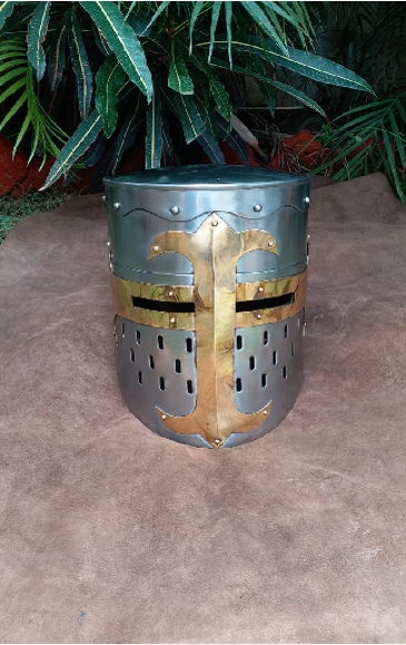 Our crusader helmet is a transitional helmet that dates from 12th and 13th century. It is constructed from steel with a decorative brass cross .